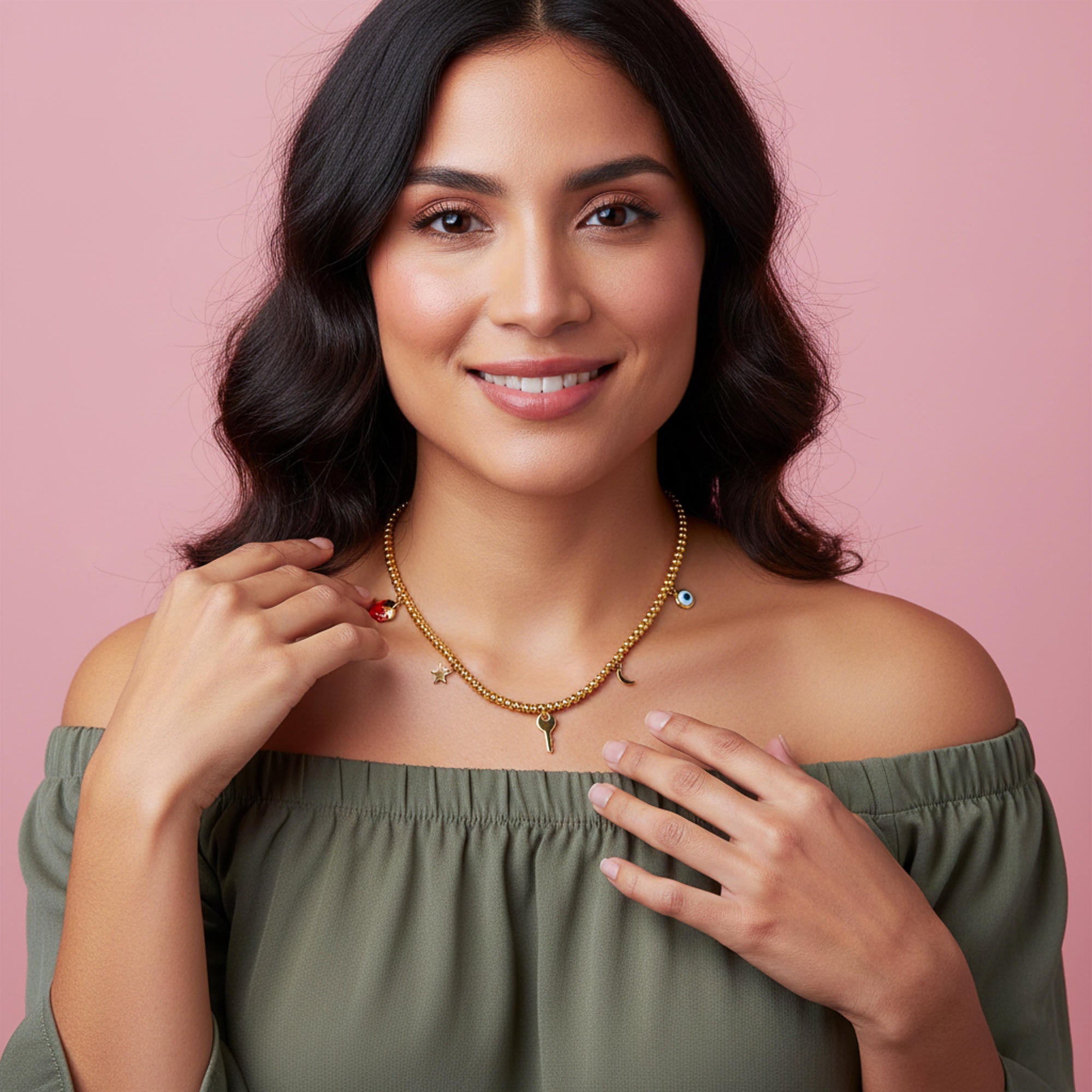 Collar con dijes de llave luna estrella fresa y ojo turco 45-50cm