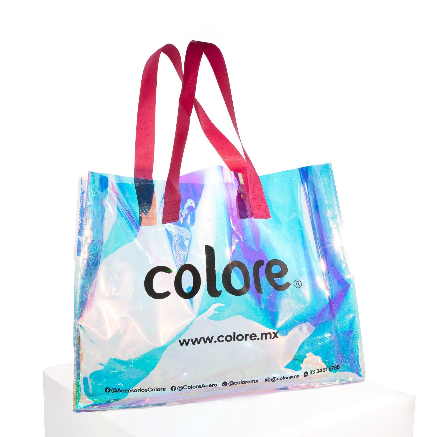 Complementa tu look y brilla con esta moderna y práctica bolsa reutilizable Colore Tornasol, ideal para tus compras, regalos y uso diario, sin perder ese toque vibrante que te hará destacar.