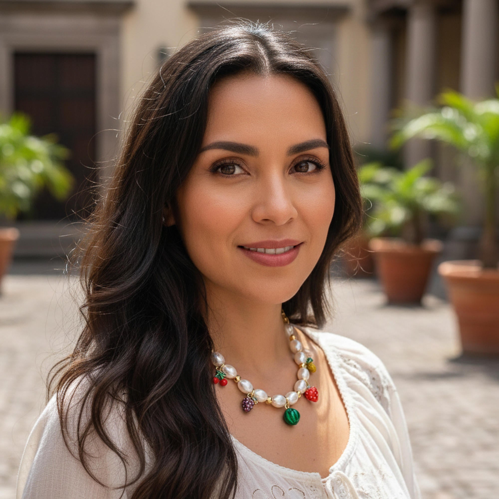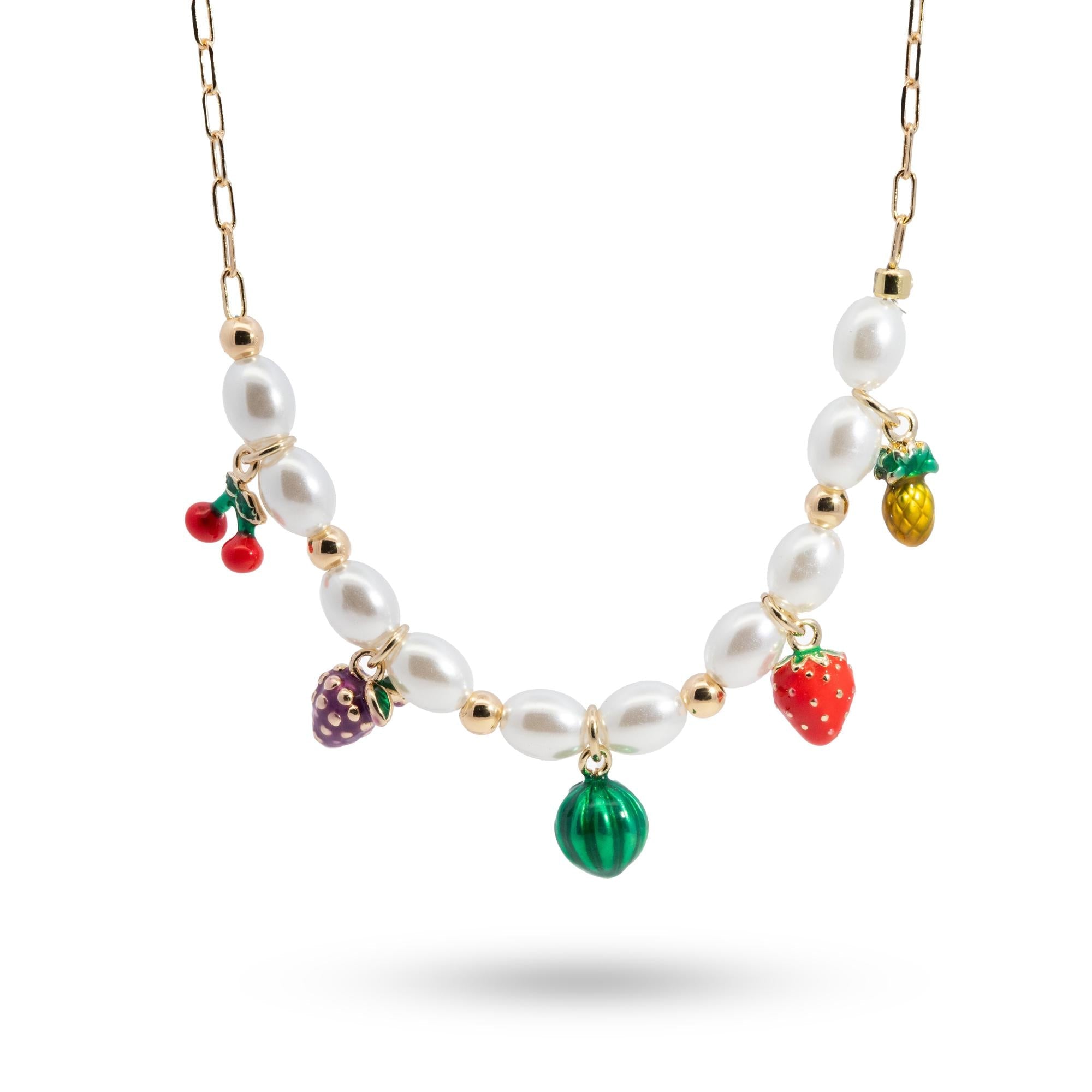 Collar con perlas y dijes de frutas esmaltadas 45-50cm