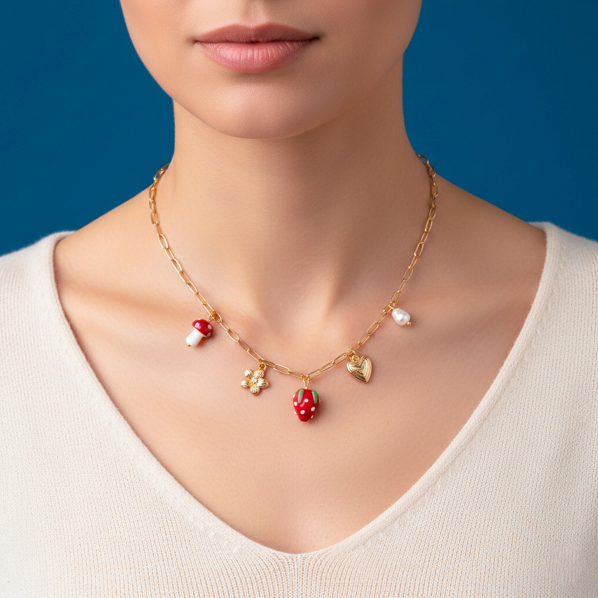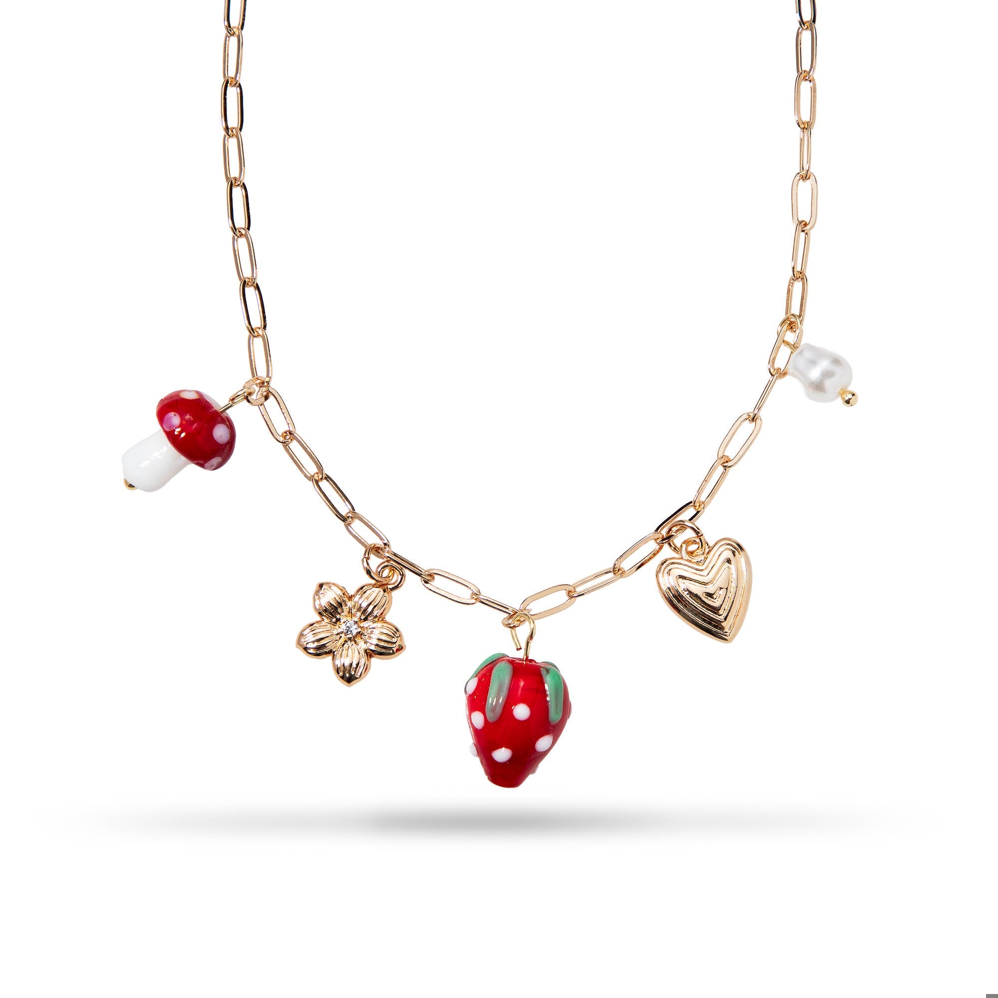 Collar de fresa y hongo esmaltados con perla flor y corazon 45-50cm
