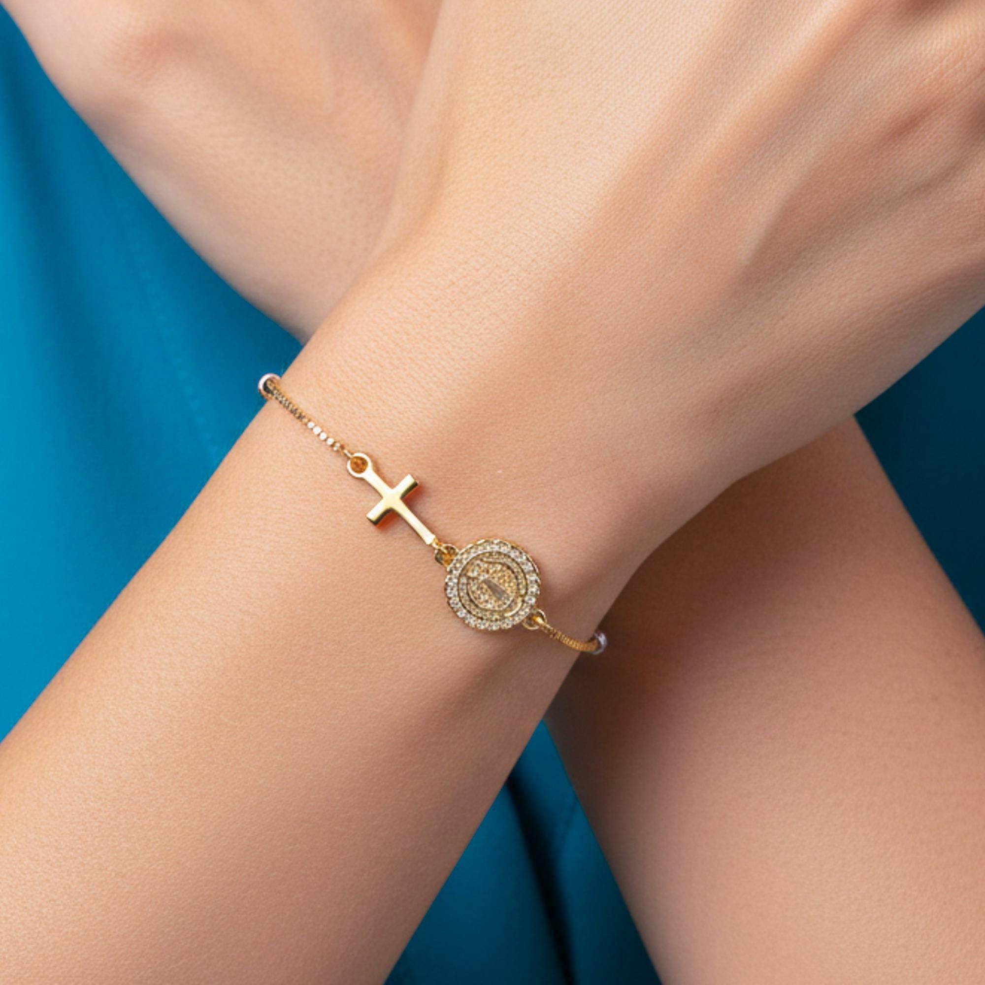 Pulsera ajustable Cruces y Medalla de San Benito con circonias 26cm