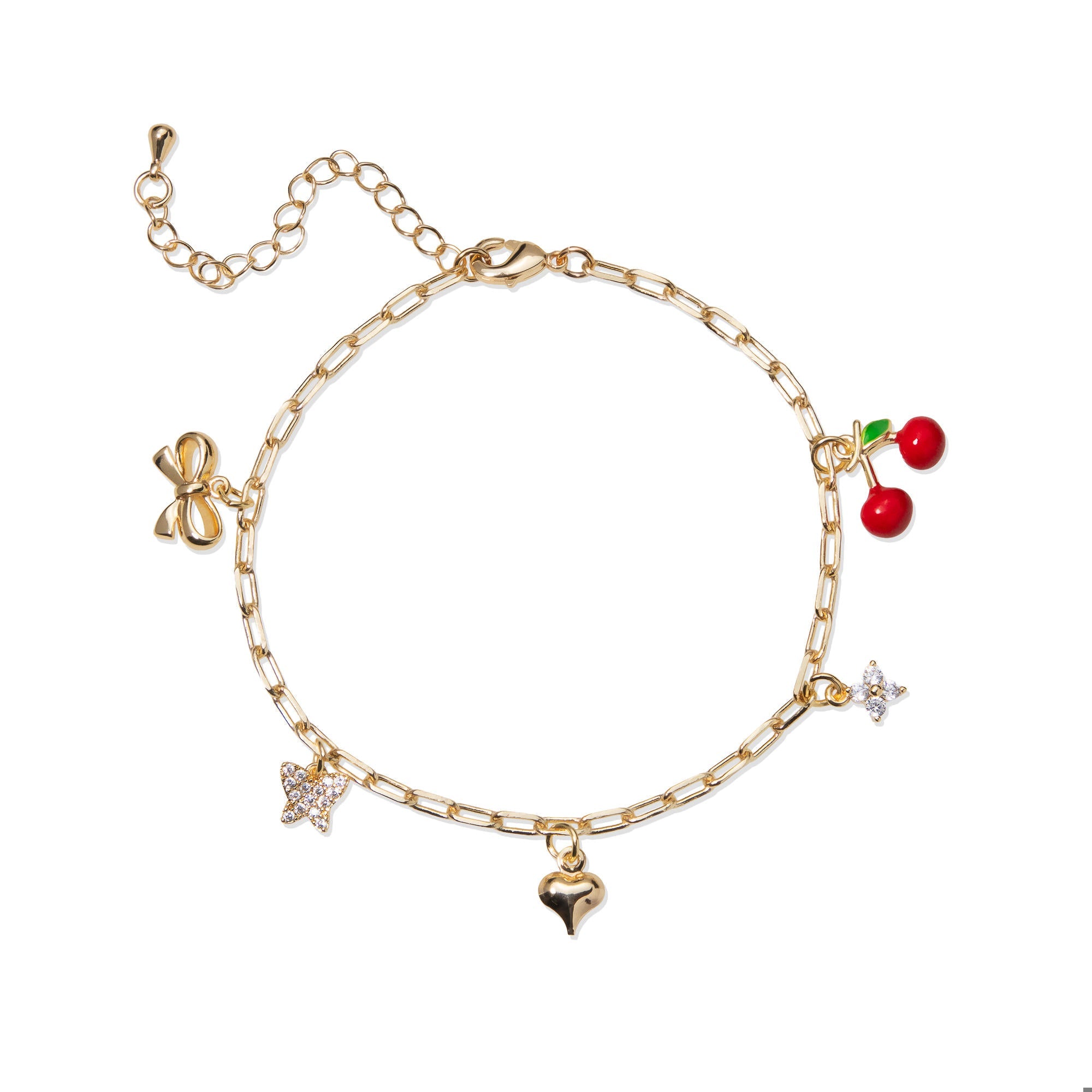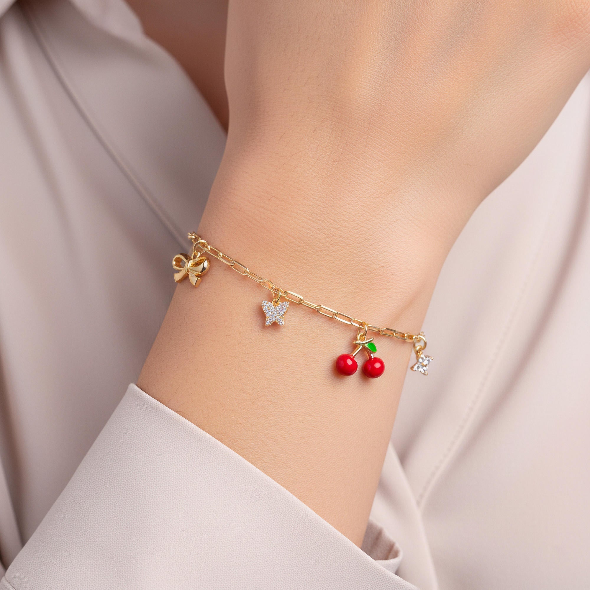 Pulsera de cerezas esmaltadas moño mariposa flor y corazon 18-23cm