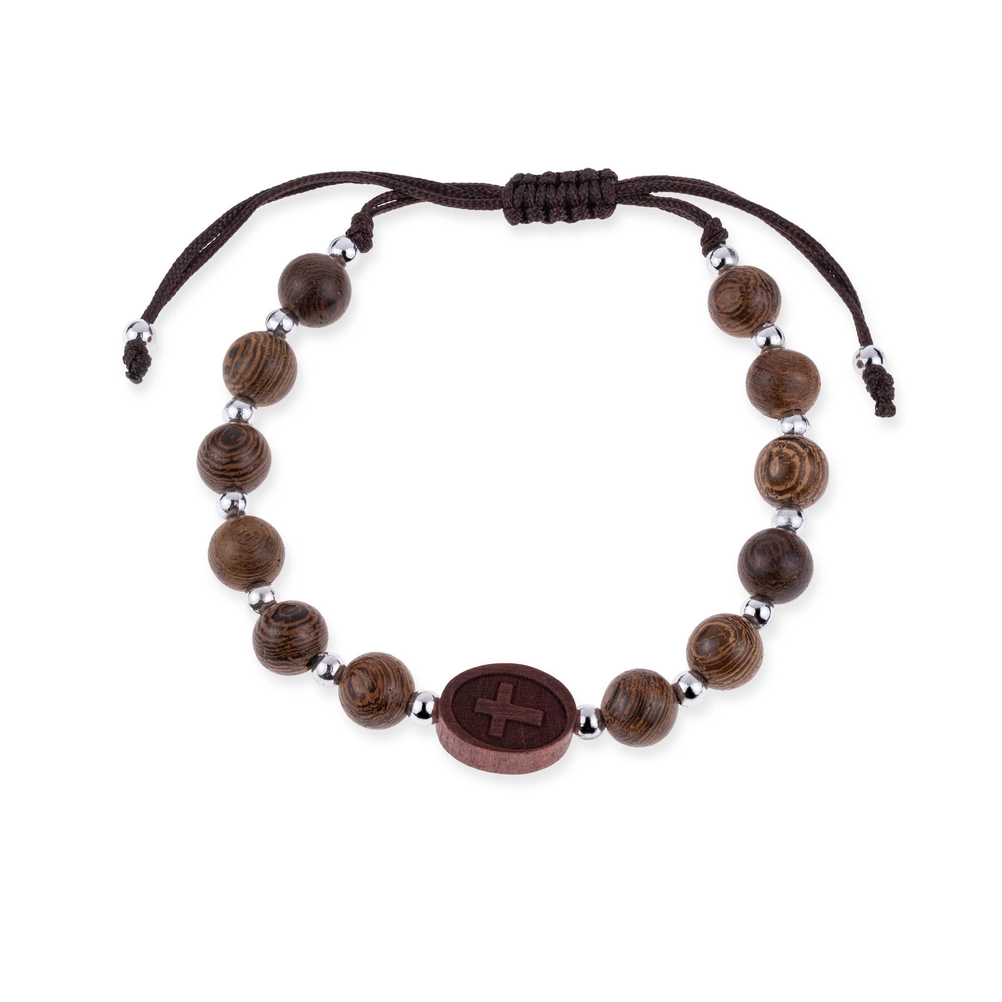 Pulsera de hilo ajustable con medalla de cruz y cuentas de madera 8mm