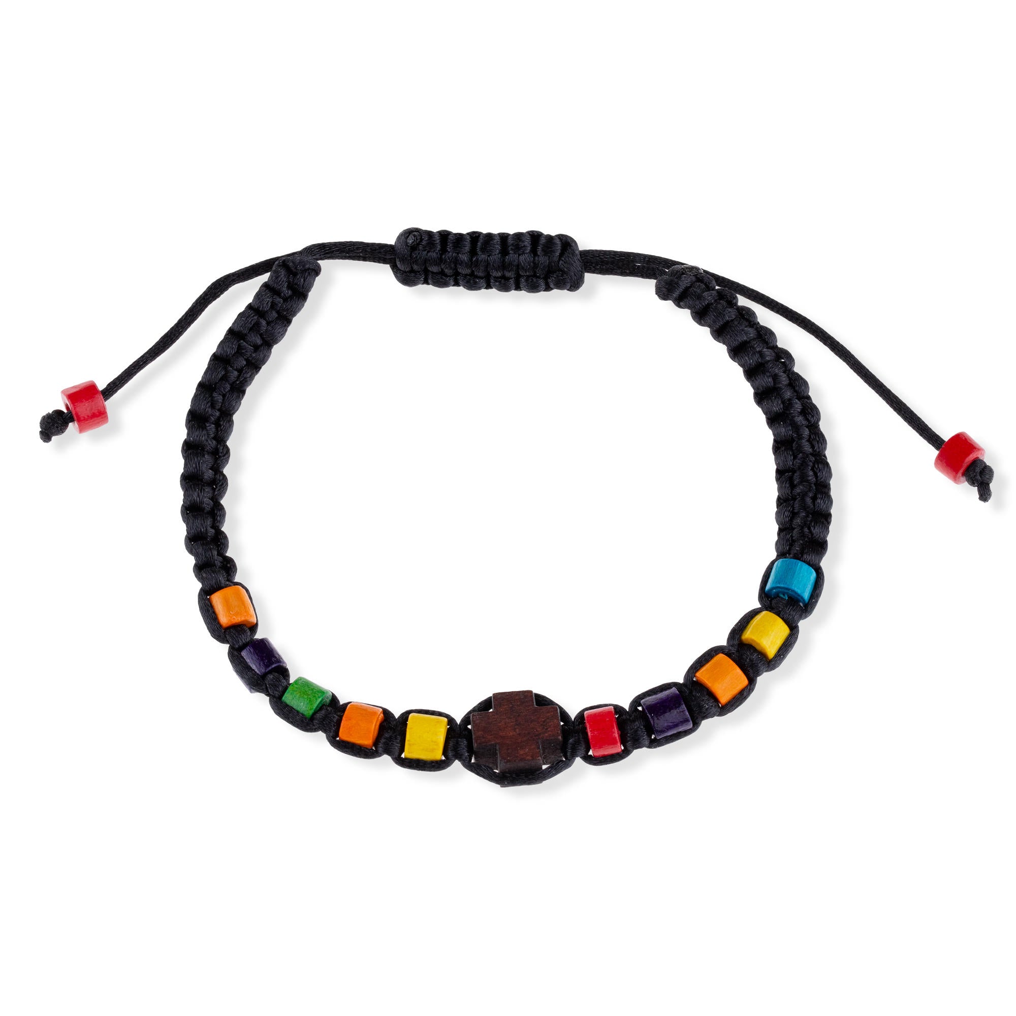 Pulsera de hilo ajustable con cruz y cuentas de madera multicolor 6mm