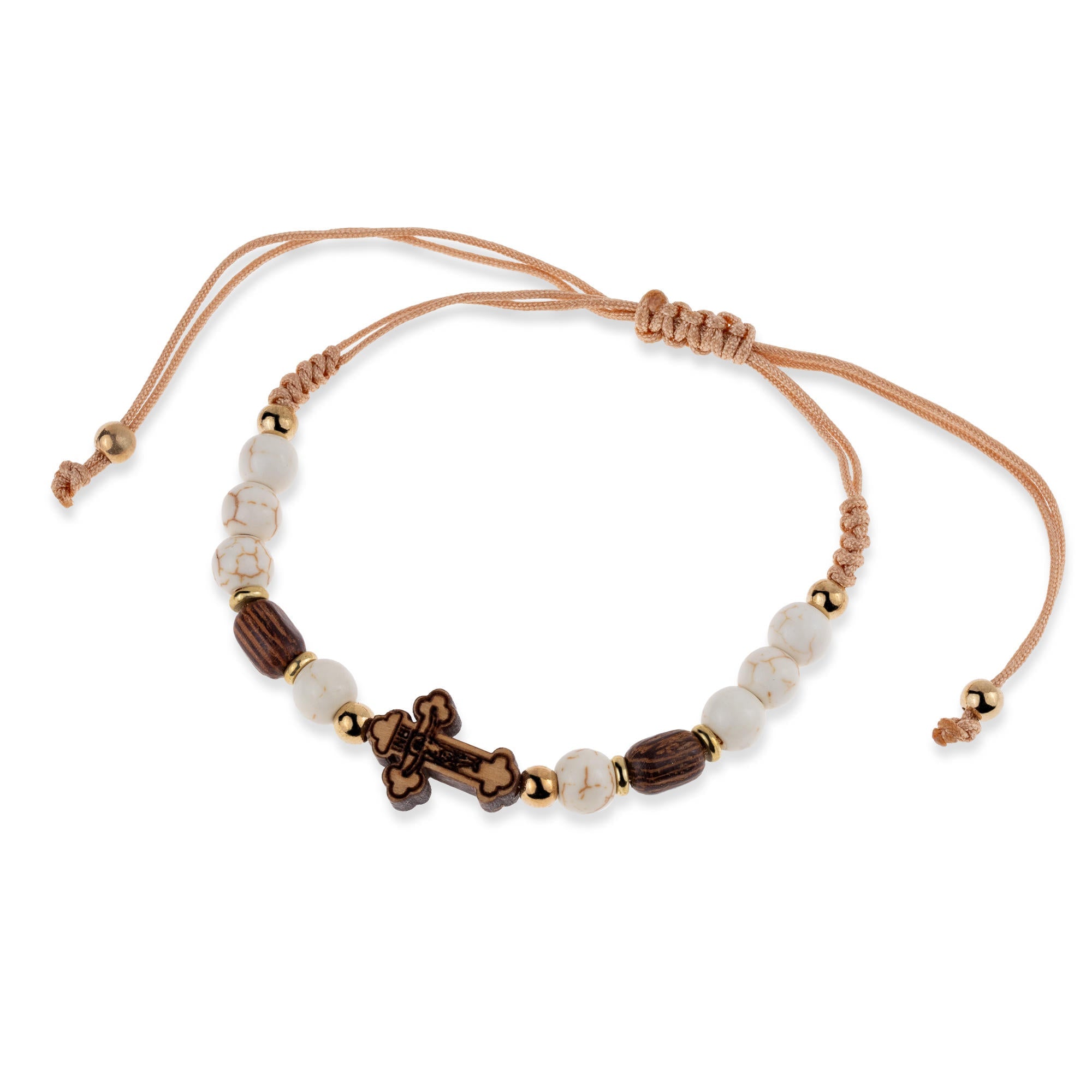 Pulsera de hilo ajustable con cruz de madera y cuentas pasta blanca 6mm