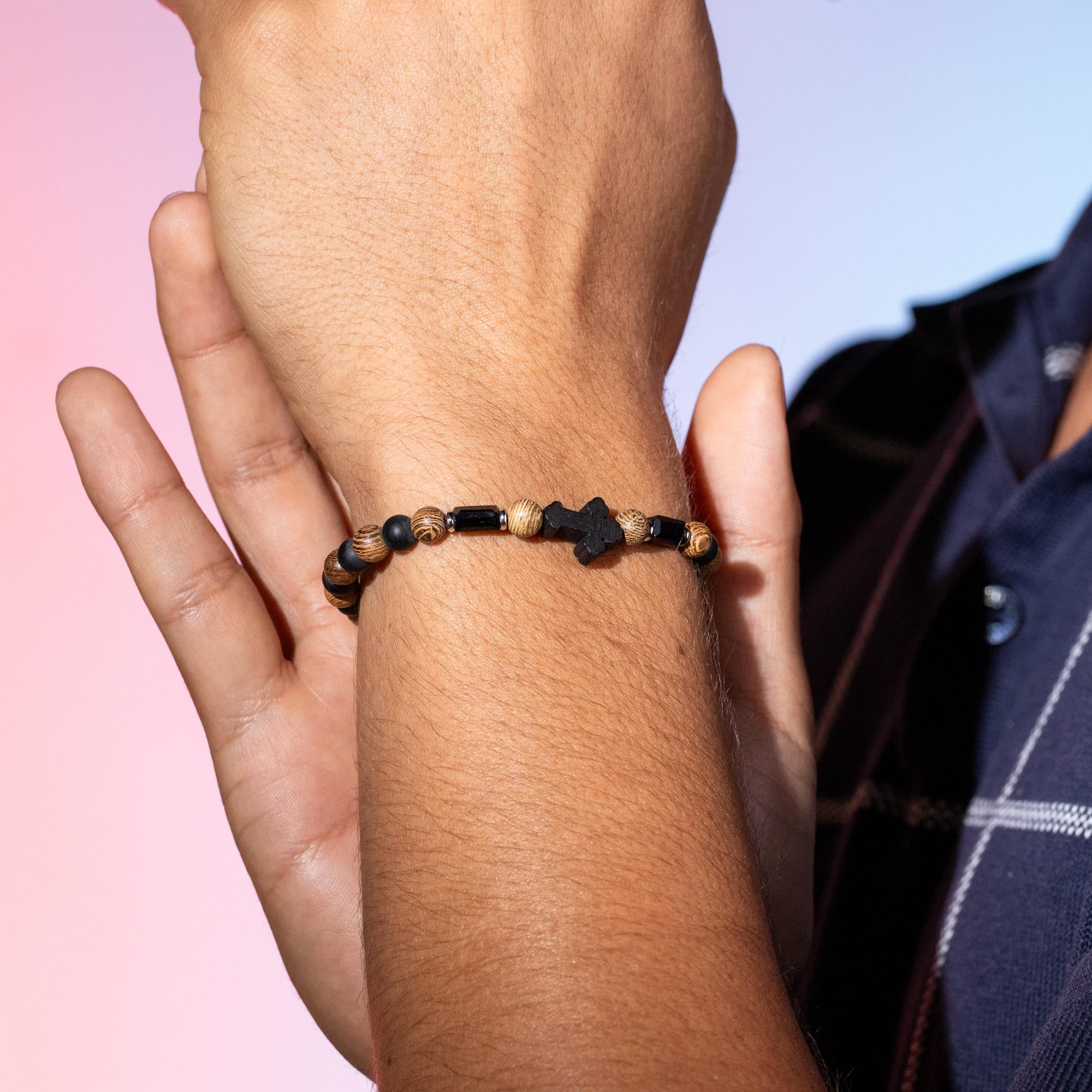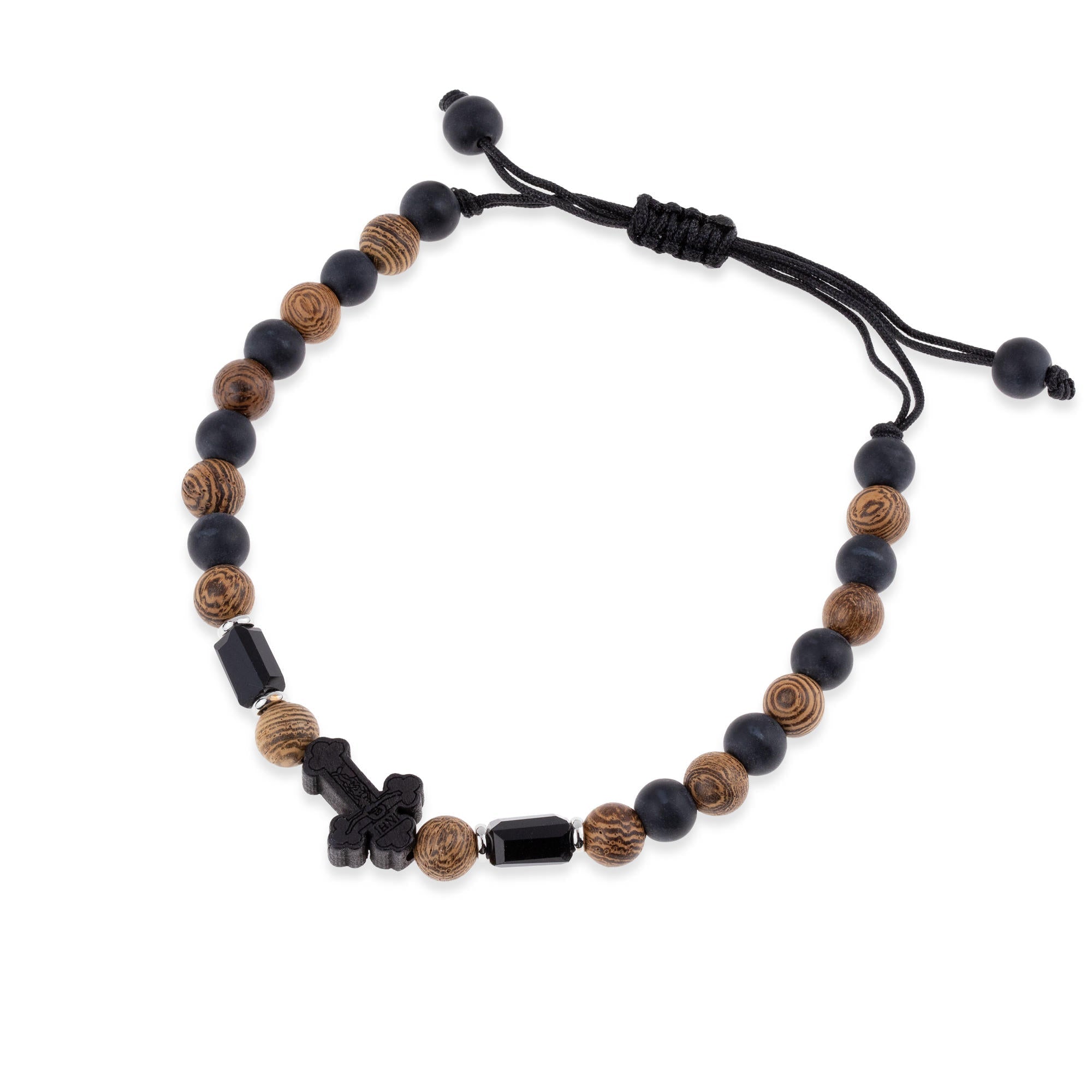 Pulsera de hilo ajustable con cruz cuentas de madera y cristales 6mm