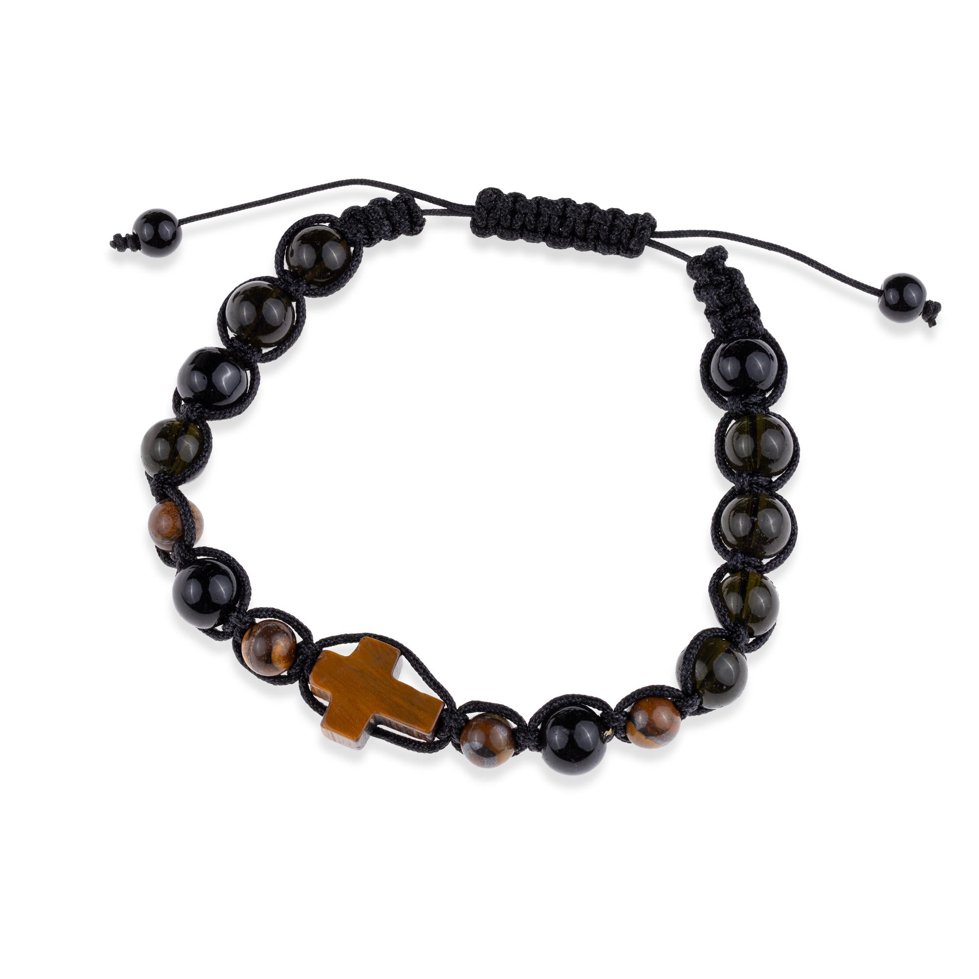 Pulsera de hilo ajustable con cruz y cuentas de piedra ojo de tigre 8mm