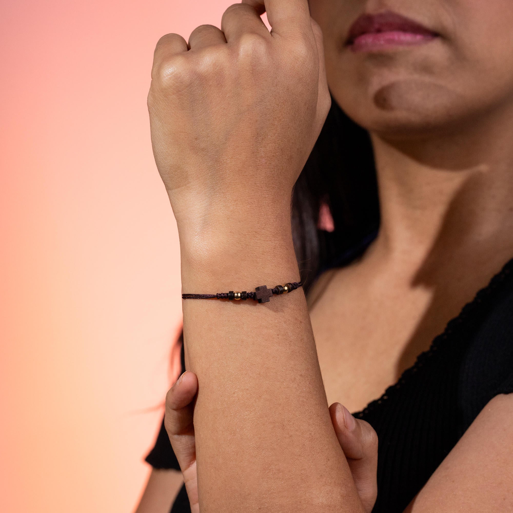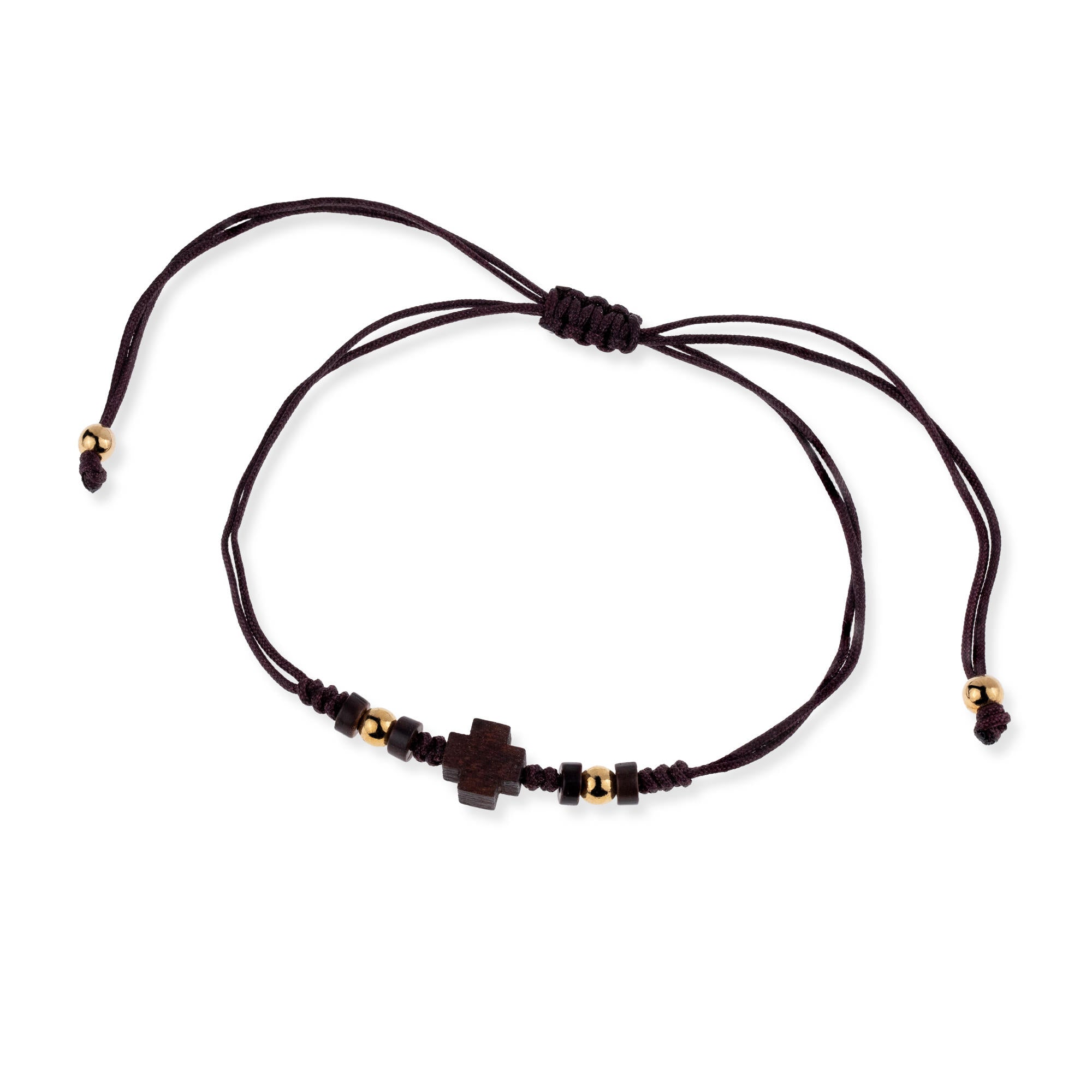 Pulsera de hilo ajustable con cruz y cuentas de madera con balines 4mm