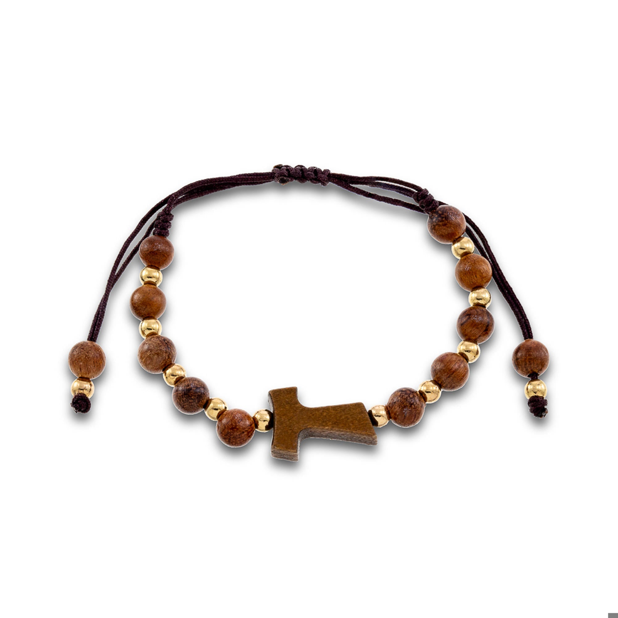 Pulsera de hilo ajustable con cuentas de madera y cruz de tau 6mm
